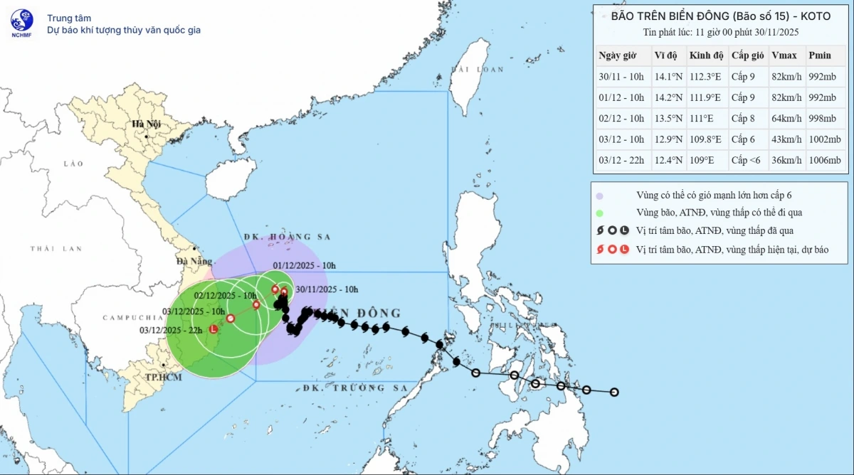 Dự báo, 10 giờ ngày 1/12, bão số 15 di chuyển hướng Bắc, với tốc độ khoảng 3km/h trên vùng biển phía Tây Bắc khu vực giữa Biển Đông, cách bờ biển phía Đông tỉnh Gia Lai-Đắk Lắk khoảng 300km về phía Đông và suy yếu dần. Gió cấp 8-9, giật cấp 11.