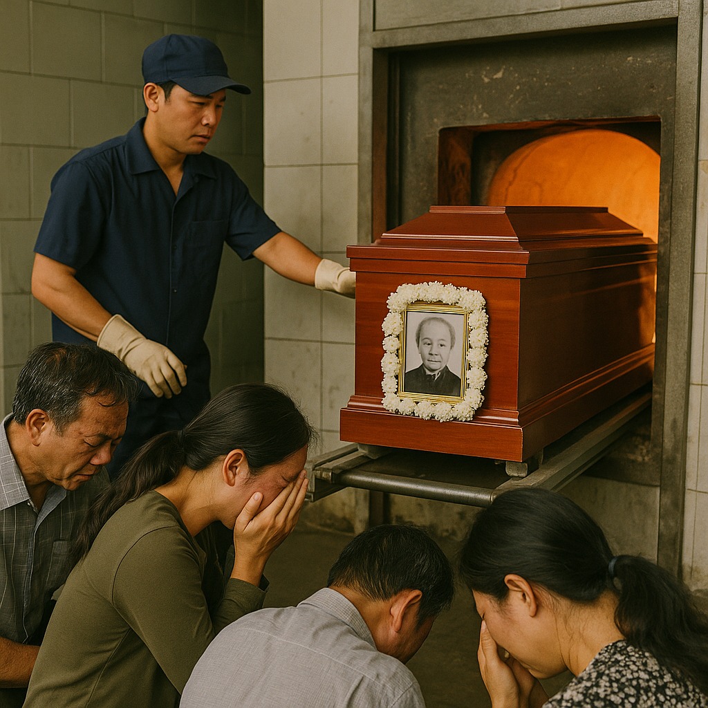 Sau lễ phát tang, chúng tôi đưa bà đến nhà hỏa táng của thành phố. Quan tài được đưa vào lò, nhang đèn nghi ngút. Chúng tôi lặng im chờ đợi ở phòng chờ — ai nấy đều trĩu nặng trong lòng.