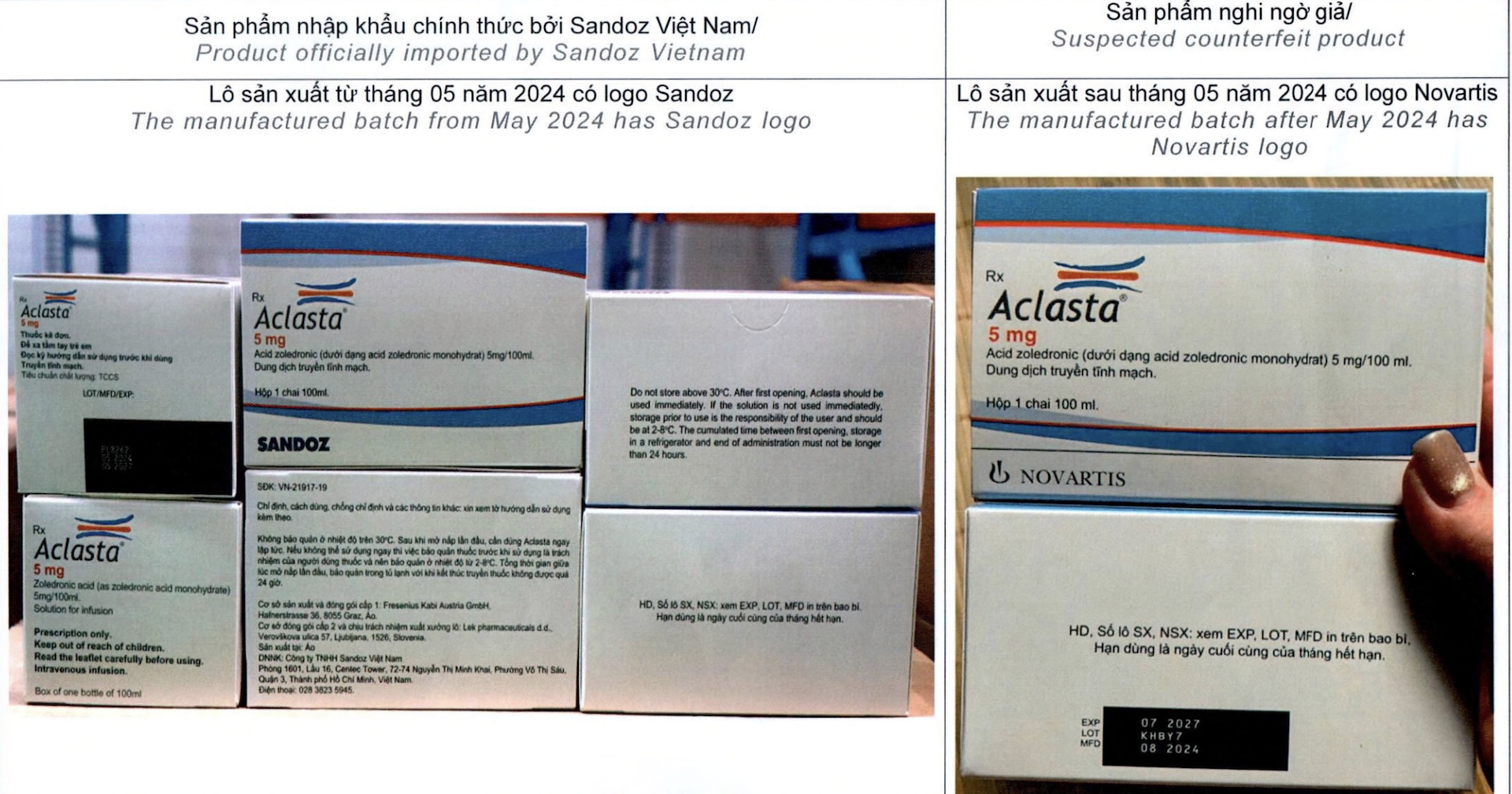 Đơn vị cho biết lô hàng không được sản xuất bởi Lek Pharmaceuticals d.d., Slovenia (nhà máy sản xuất của Sandoz), công ty không nhập lô hàng trên. Hơn nữa, lô hàng nghi giả vẫn giữ logo cũ (không còn sử dụng sau tháng 5/2024).
