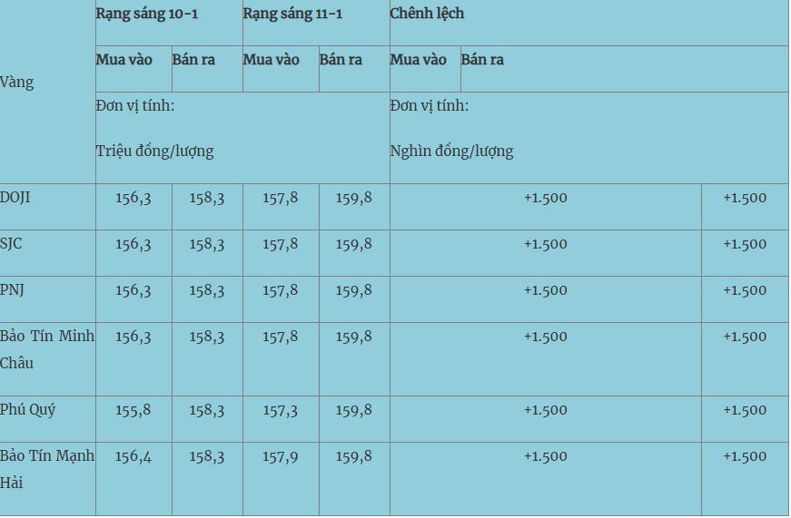 Giá vàng hôm nay (11-1): Giá vàng miếng đã tăng dựng đứng trong 24 giờ qua, với mức tăng 1,5 triệu đồng/lượng. Giá vàng nhẫn cũng cùng đà tăng, giao dịch cao nhất là 159,5 triệu đồng/lượng.
