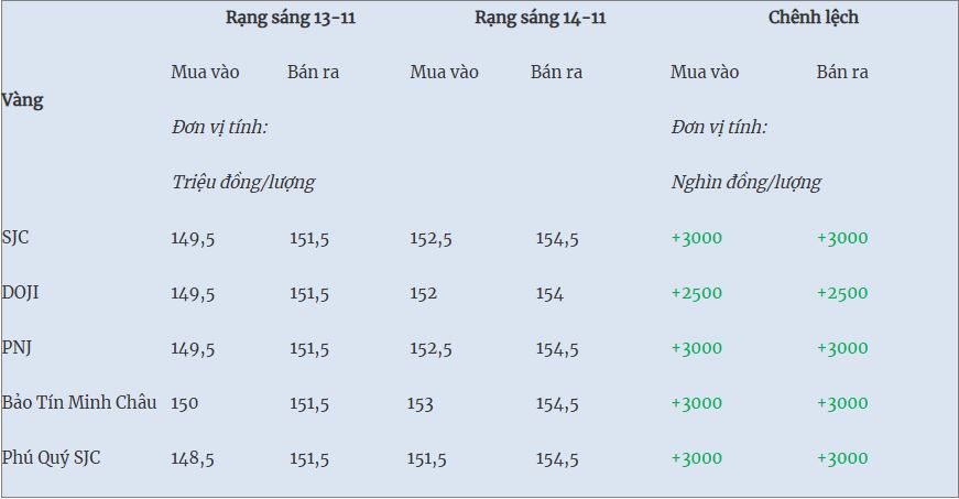 So với sáng qua, giá vàng miếng hôm nay (14-11) đồng loạt tăng cao. Cụ thể, các thương hiệu SJC, PNJ đồng loạt niêm yết giá vàng miếng ở mức 152,5 – 154,5 triệu đồng/lượng (mua vào – bán ra), tăng 3 triệu đồng/lượng ở cả hai chiều.