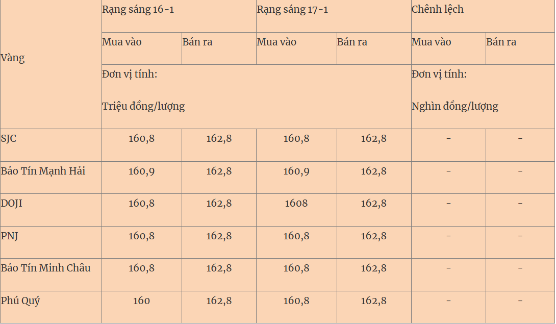 Giá vàng miếng trong nước cập nhật sáng 17-1 như sau: