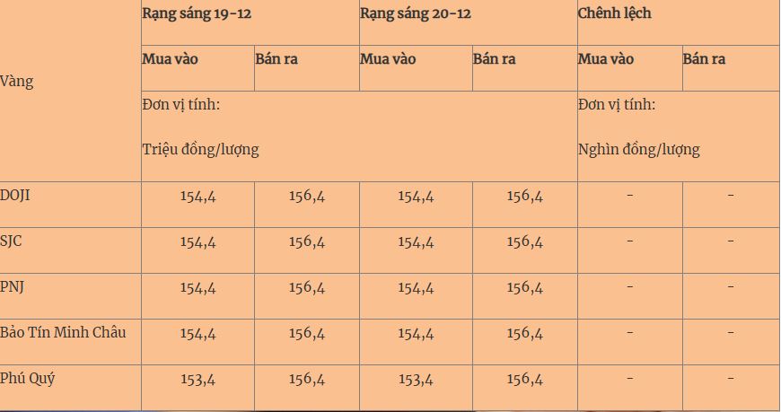 Giá vàng miếng trong nước cập nhật sáng 20-12 như sau: