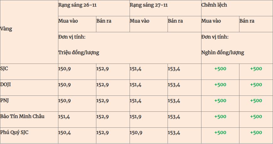 Giá vàng miếng trong nước cập nhật sáng 27-11 như sau: