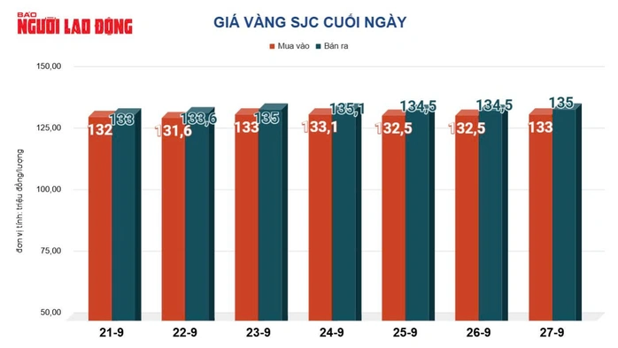 Cuối tuần ngày 28-9, giá vàng miếng SJC được các doanh nghiệp lớn niêm yết ở mức 133 triệu đồng/lượng mua vào và 135 triệu đồng/lượng bán ra, tăng 2 triệu đồng mỗi lượng so với cuối tuần trước.