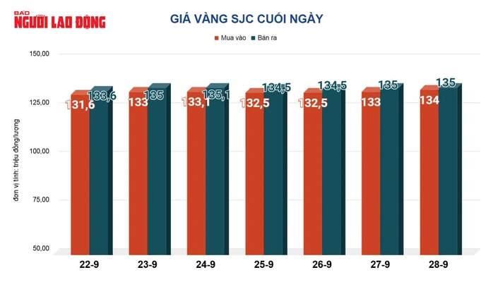 Sáng thứ hai, 29-9, Công ty Vàng bạc Đá quý Sài Gòn (SJC) niêm yết giá vàng miếng SJC mua vào 133,5 triệu đồng/lượng và bán ra 135,5 triệu đồng/lượng bán ra, tăng thêm 500.000 đồng mỗi lượng so với cuối tuần.