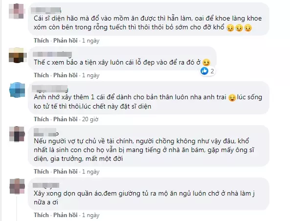 Thế nhưng anh chồng cảm thấy không thể chấp nhận cảnh cả làng nhìn mình với ánh mắt xem thường, nên: “Chẳng lẽ cả làng xây được mà anh không xây được à?”.