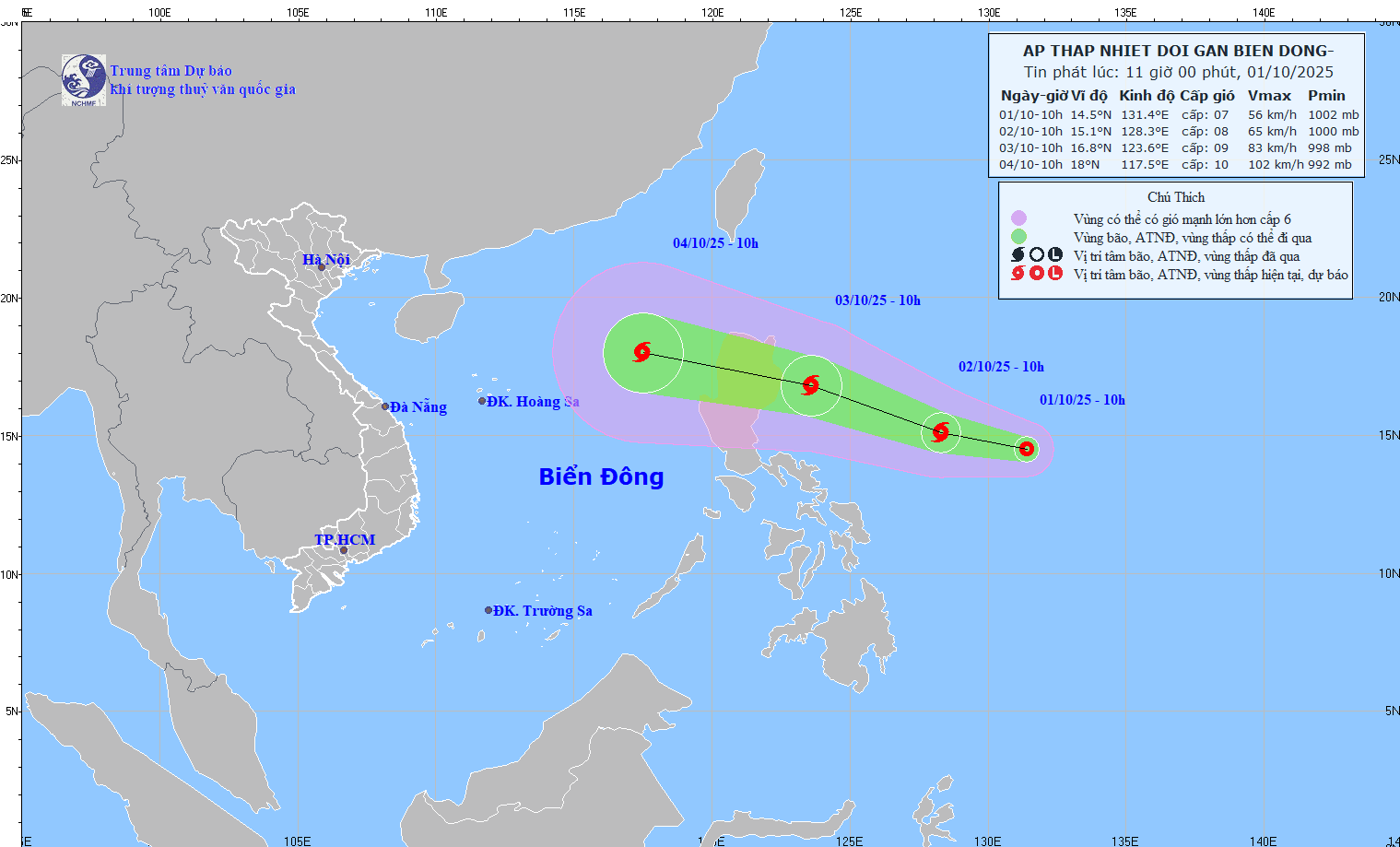 Trung tâm Dự báo khí tượng thủy văn quốc gia thông tin, sáng nay (1/10), vùng áp thấp ở vùng biển phía Đông đảo Lu-Dông đã chính thức mạnh lên thành áp thấp nhiệt đới. Hồi 10h, vị trí tâm áp thấp nhiệt đới được xác định ở khoảng 14,5∘ Vĩ Bắc; 131,4∘ Kinh Đông. Sức gió mạnh nhất vùng gần tâm đạt cấp 6-7 (39-61km/giờ), giật cấp 9. Hiện áp thấp nhiệt đới đang di chuyển theo hướng Tây Tây Bắc với tốc độ khoảng 15km/giờ.