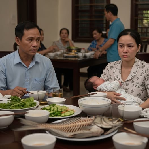Khi xong xuôi, Linh quay lại mâm cơm. Mắt cô khựng lại. Trên mâm cơm chỉ còn bộ xương cá lạnh ngắt, mấy cọng rau luộc đã bị lùa sạch, bát canh cạn gần đáy.